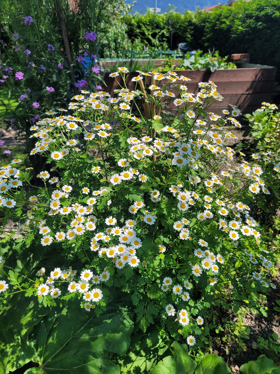 Feverfew was already described as a medicinal herb by Dioscorides in the 1st century. The name feverfew comes from its use for pregnancy problems - it induces menstruation and promotes the separation of the placenta.