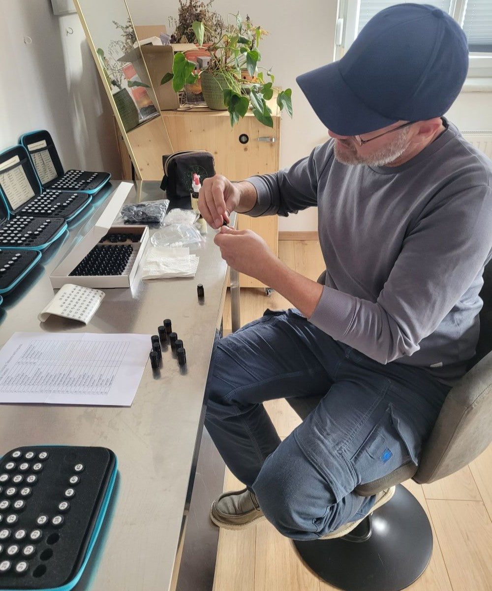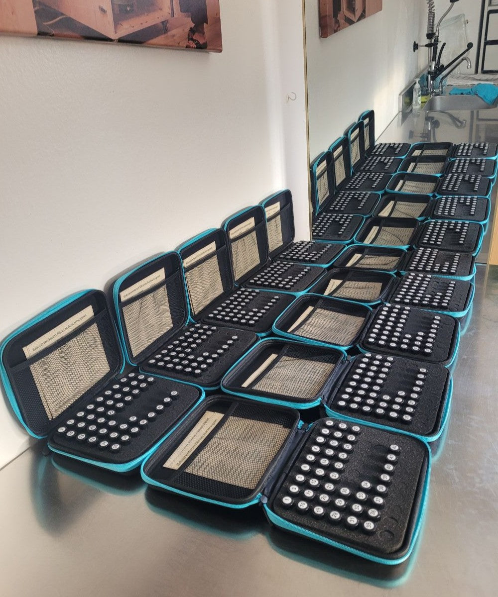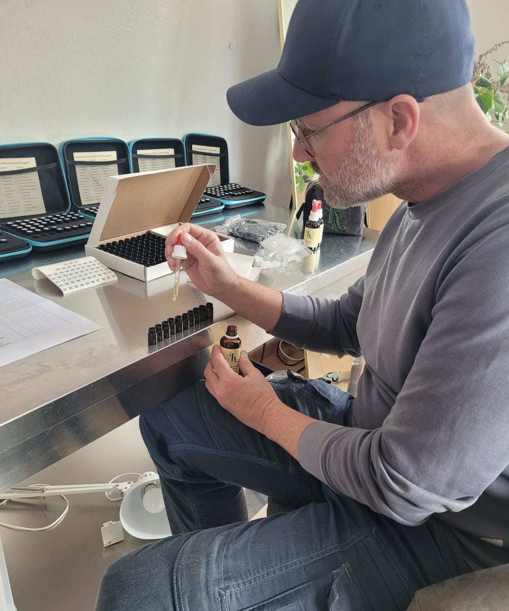 Im Austestungsset für Therapeuten findest du alle 42 Essenzen, Tinkturen und Körperpflege-Öle der Kräuterwerkstatt in 2ml Flascherl, elegant und praktisch im Tascherl mit Reisverschluss verpackt.