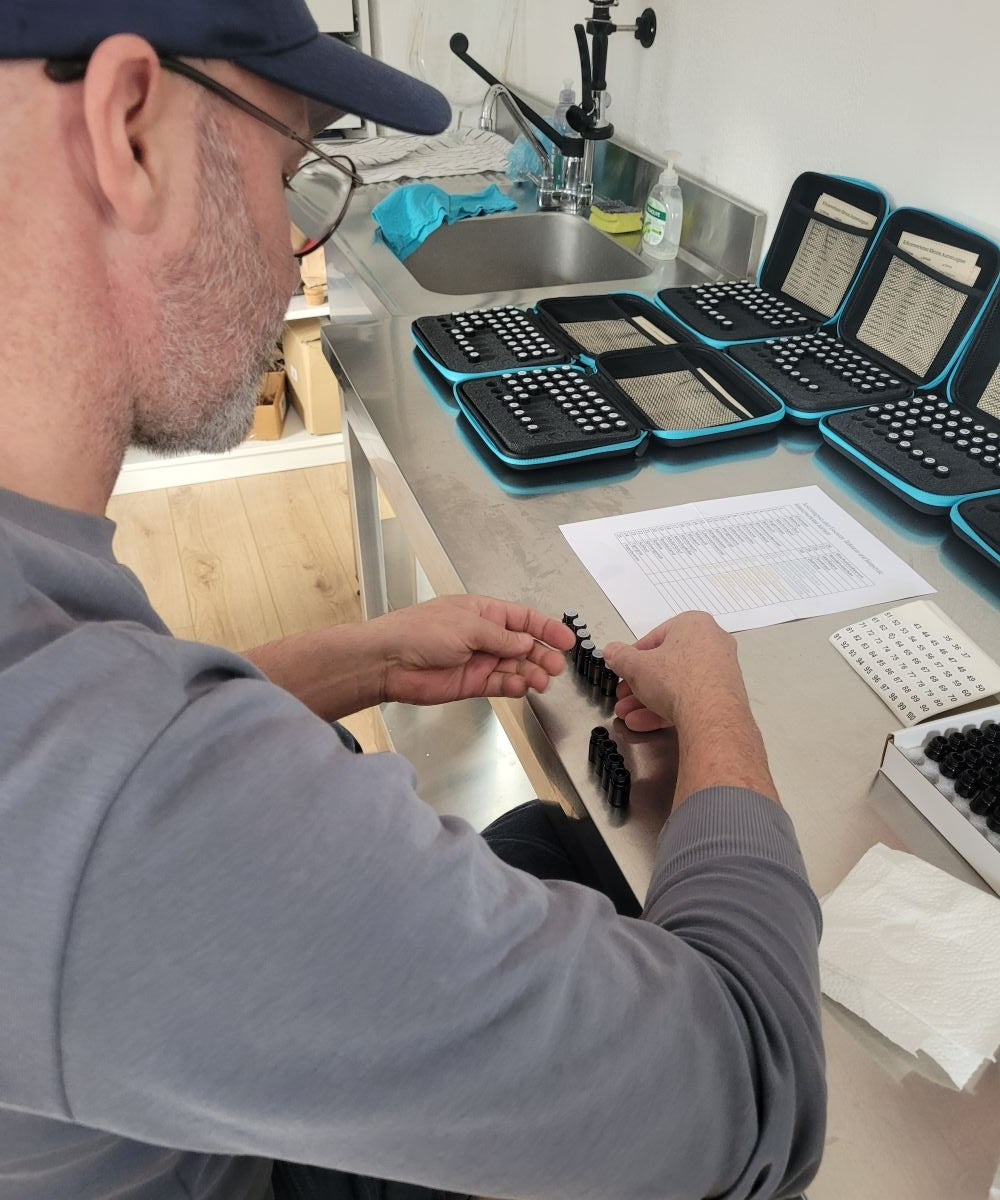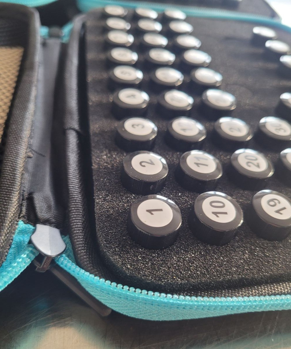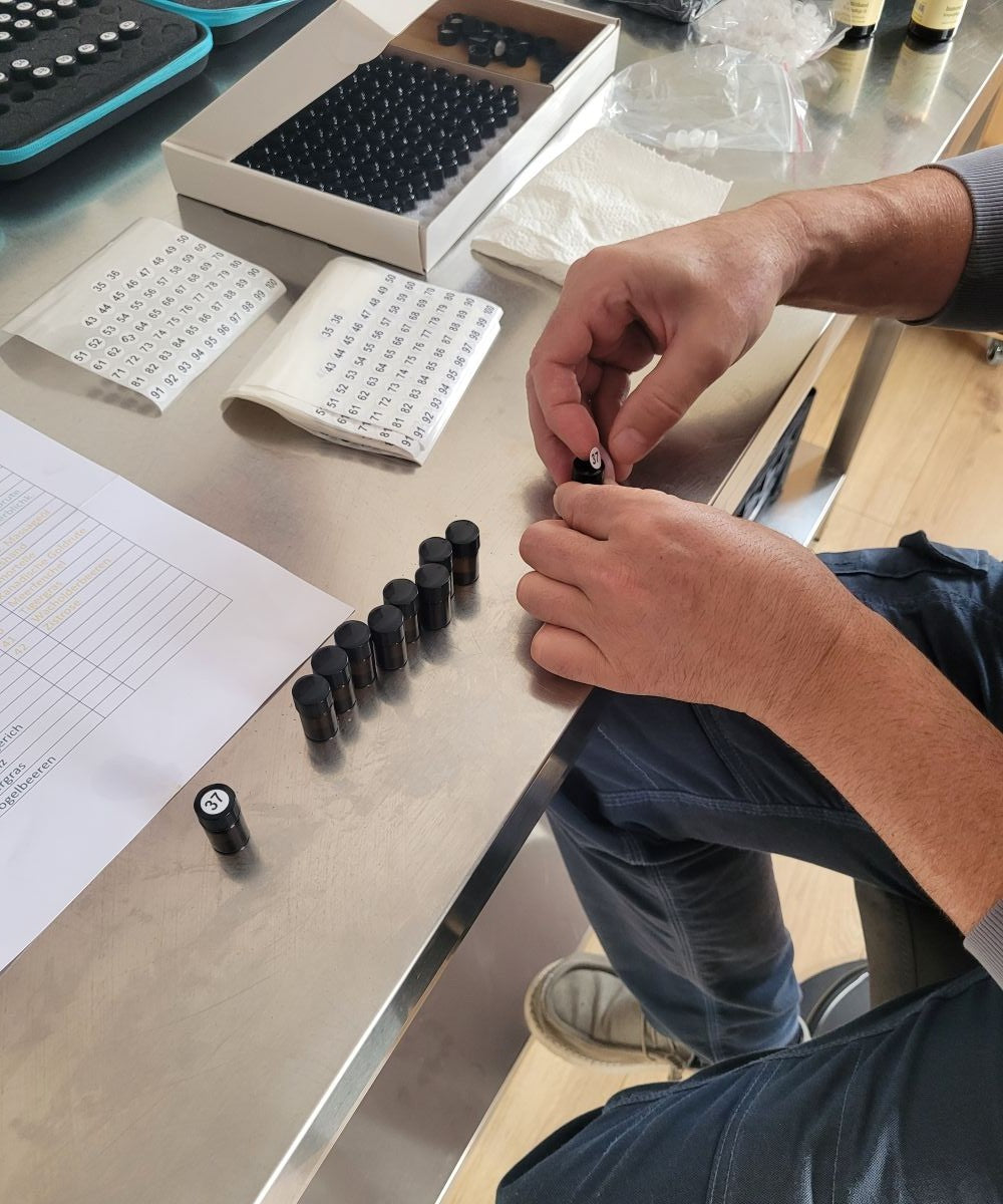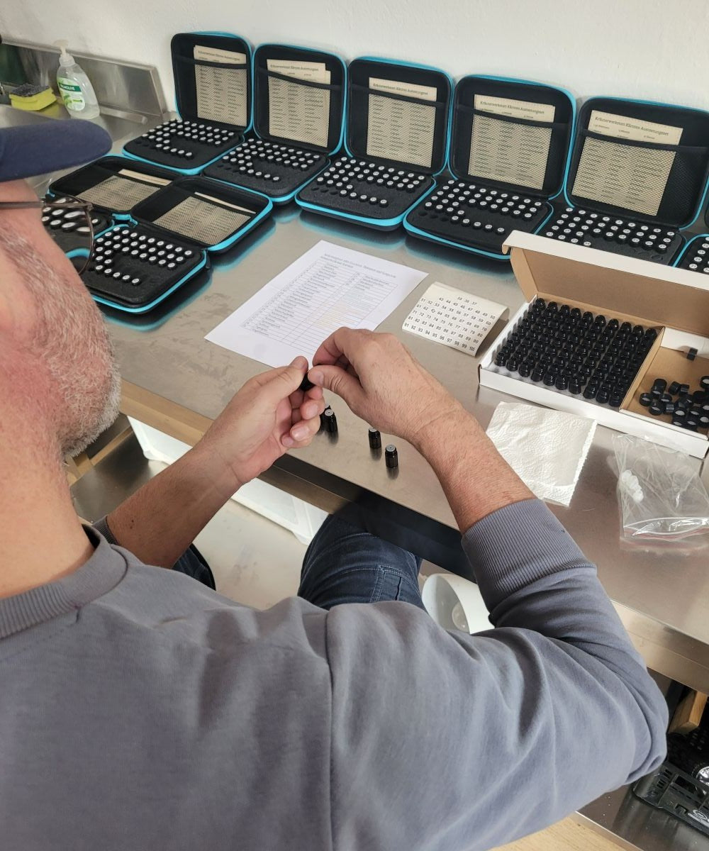 Im Austestungsset für Therapeuten findest du alle 42 Essenzen, Tinkturen und Körperpflege-Öle der Kräuterwerkstatt in 2ml Flascherl, elegant und praktisch im Tascherl mit Reisverschluss verpackt.