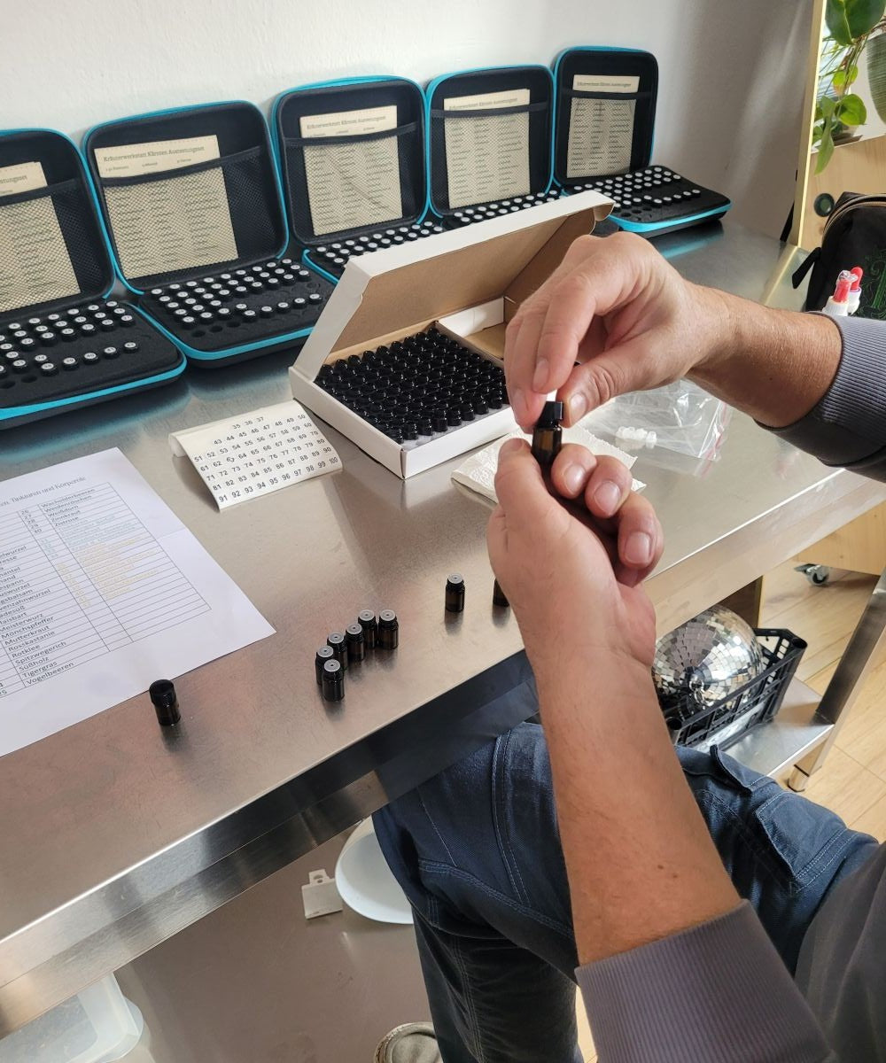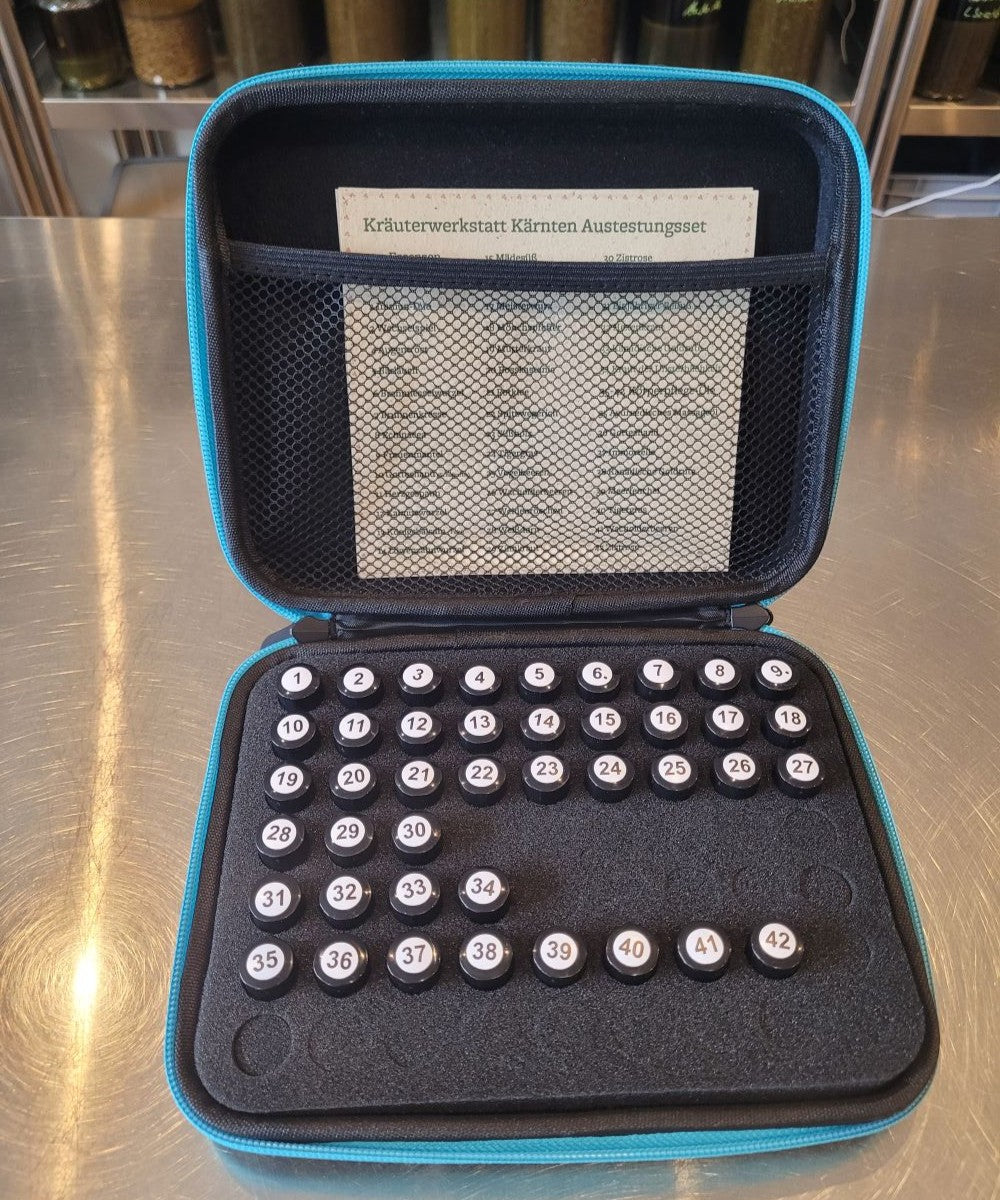 Inhalt: 42 nummerierte Testflascherl, davon 30 Essenzen, 4 Tinkturen und 8 Körperpflege-Öle, zwei Listen mit der Nummernzuordnung und eine Tasche mit Reisverschluss