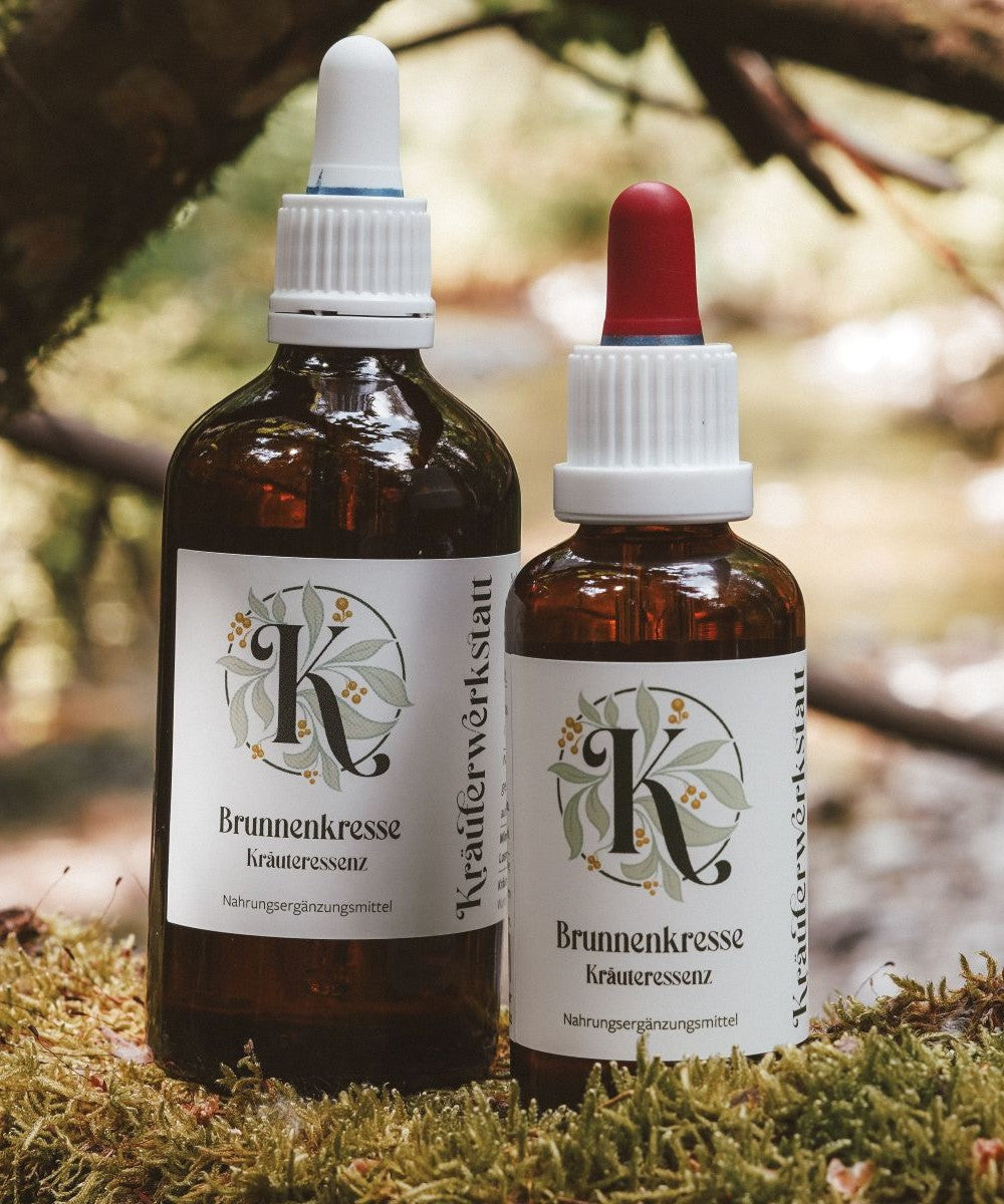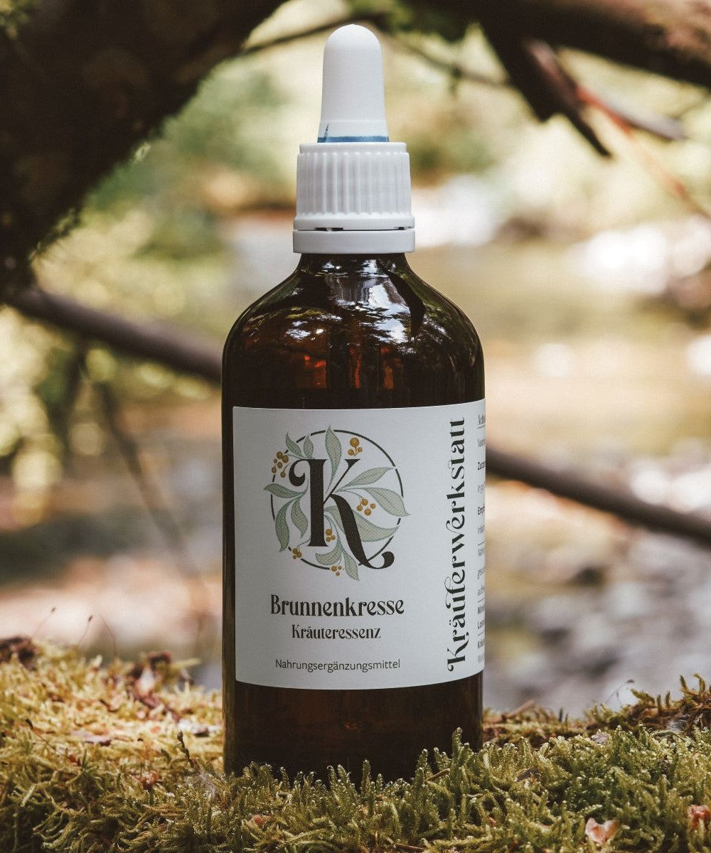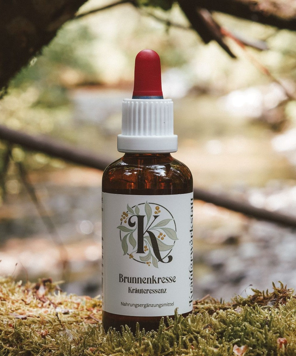 Bio-Kornbrand*, naturbelassene Brunnenkresse aus eigenem Anbau. In achtsamer Handarbeit von Nicole und Andreas frisch im Essenz-Labor zu diesem Auszug verarbeitet. *enthält 38%vol Alkohol