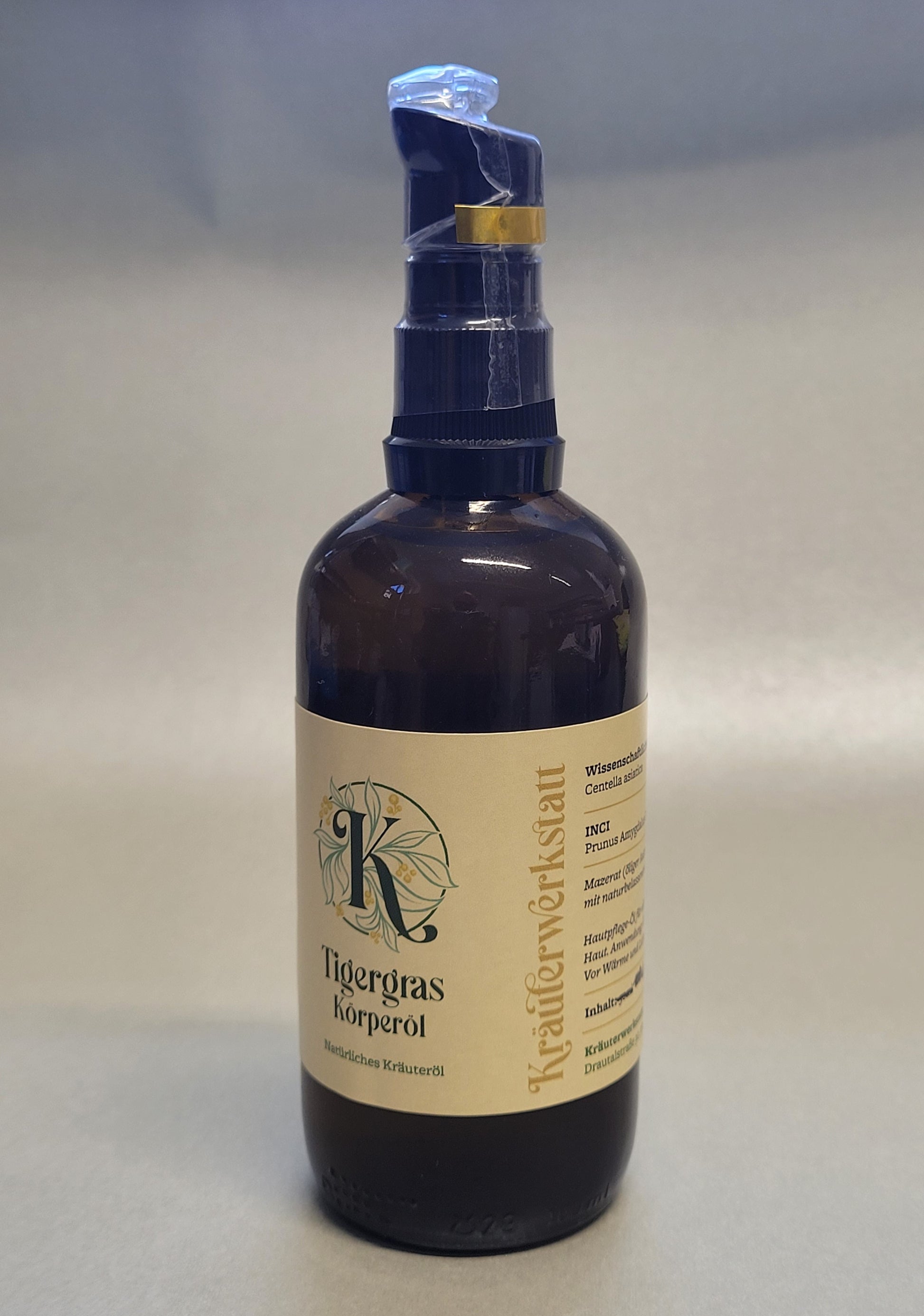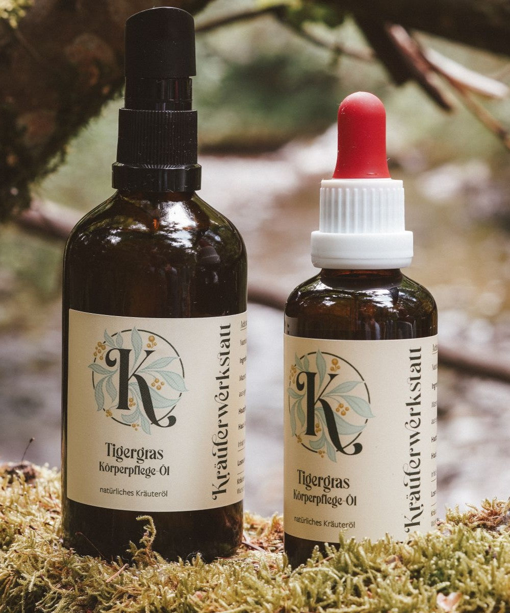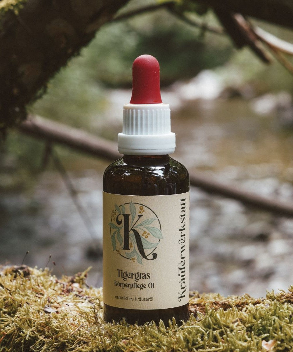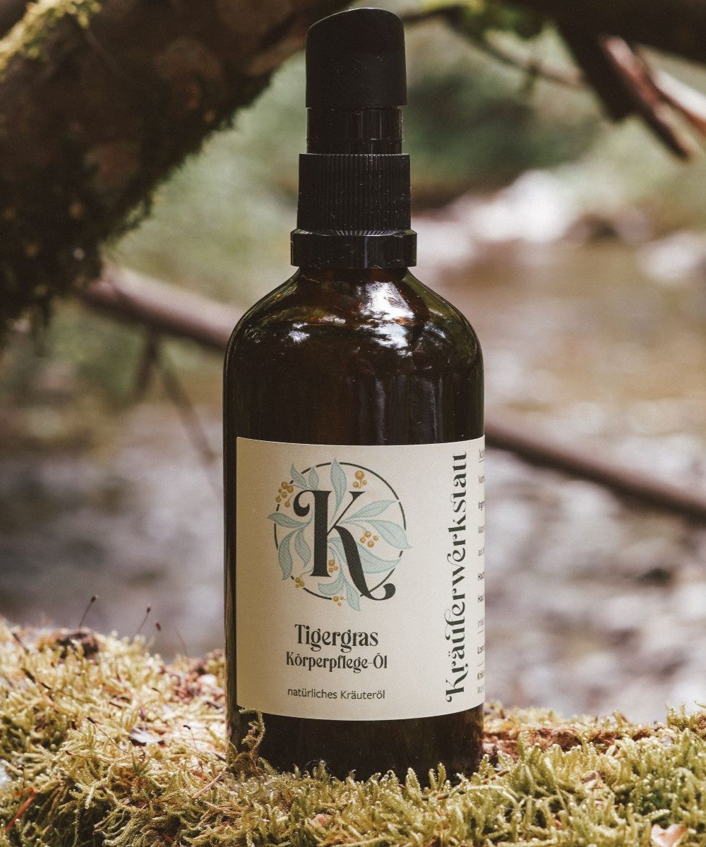 Das Tigergras-Öl der Kräuterwerkstatt Kärnten ist ein Mazerat (öliger Auszug) aus Bio-Mandel-Öl und naturbelassenem Tigergras aus eigener Kärntner Gartenkultur.