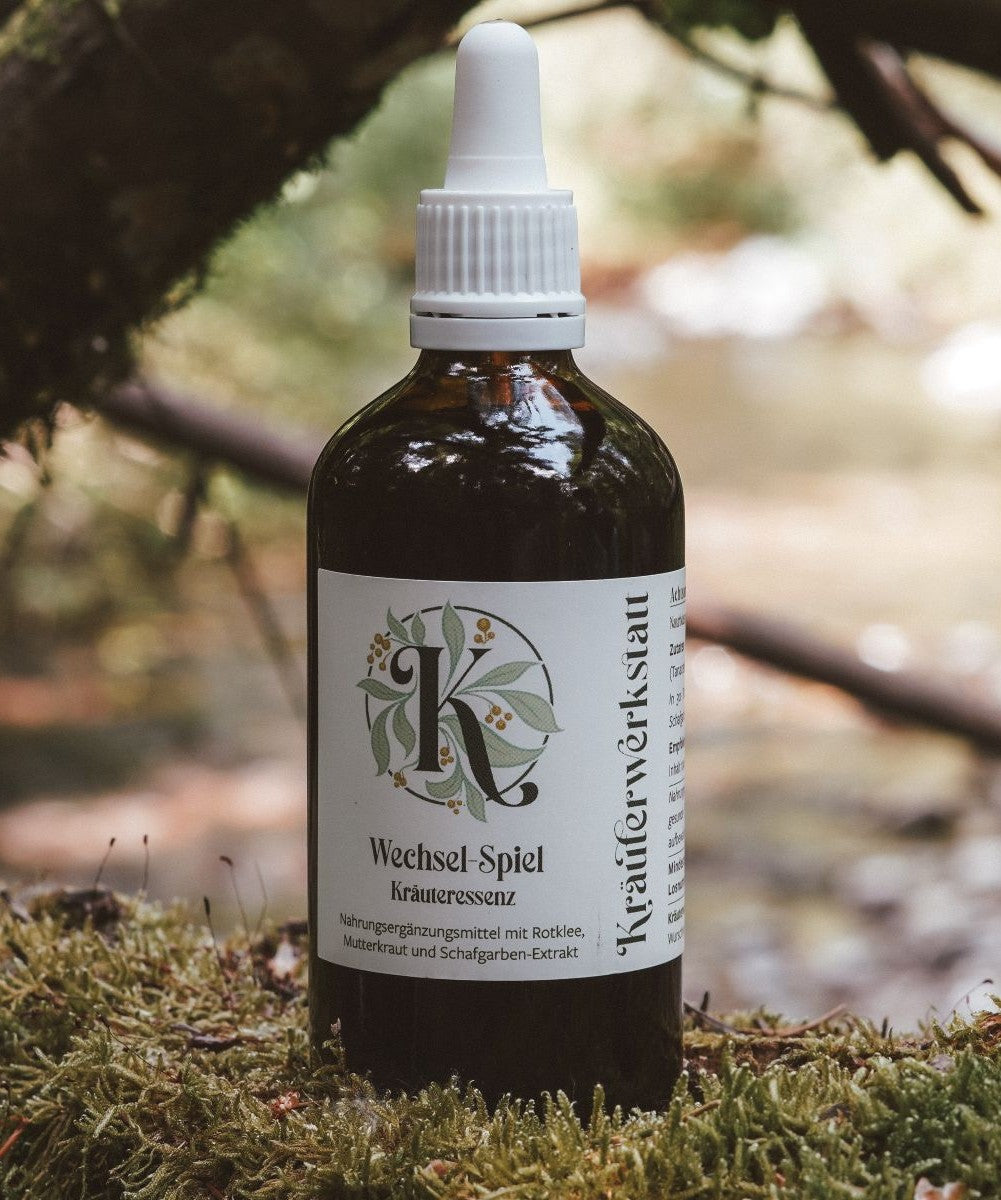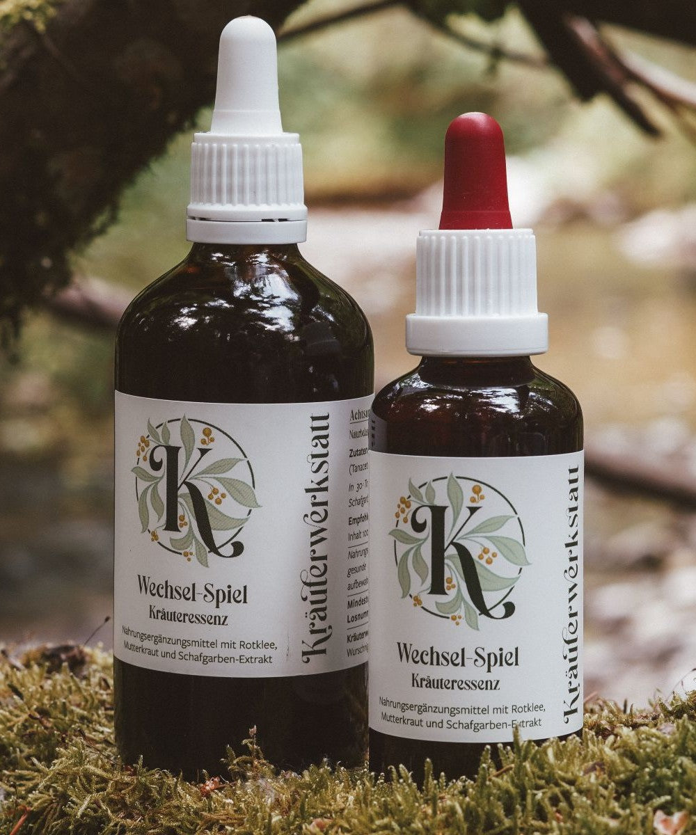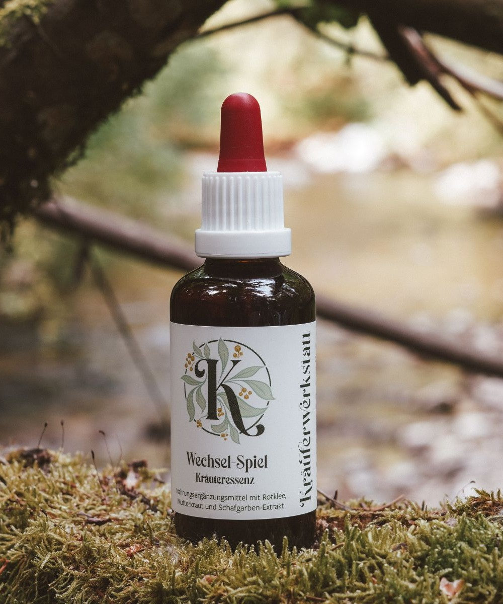 Ein Wechselspiel aus unseren Kräuteressenzen Rotklee, Gotteshand (Schafgarbe) und Mutterkraut (Bertram) zu gleichen Teilen.